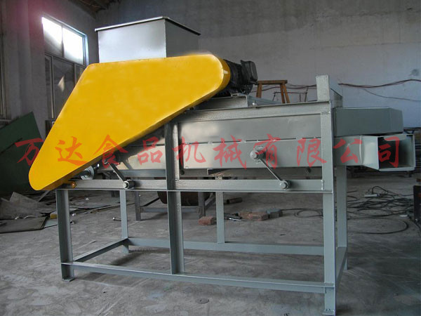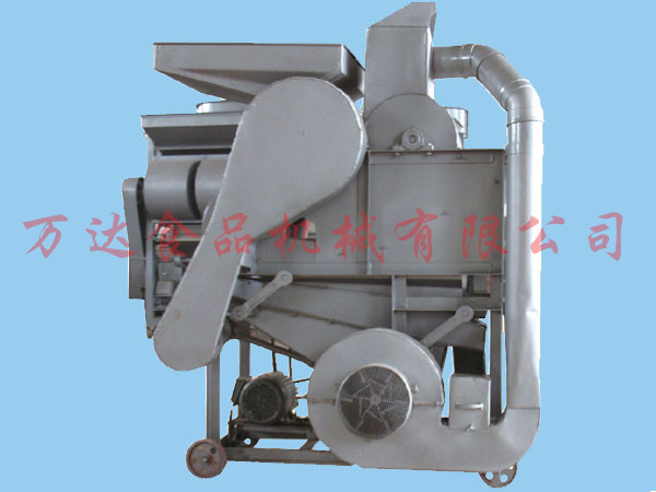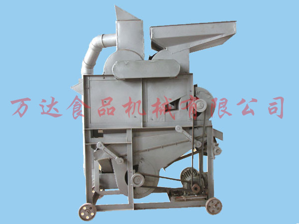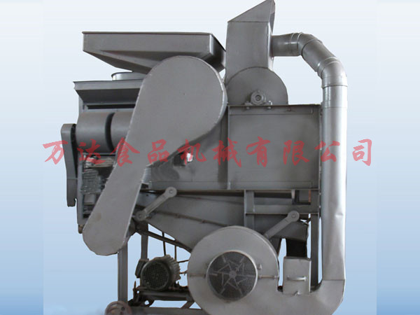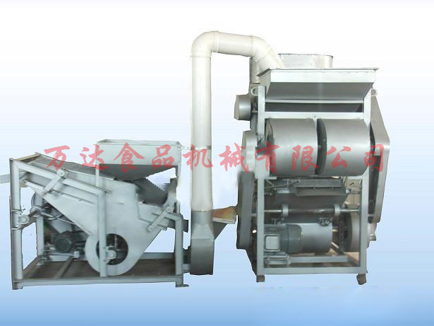 結構及工作原理:本機采用紋纖、柵條、凹板、風機、比重分選篩及二次提升機等幾部分組成,結構簡單緊湊、性能穩定、安全可靠。工作原理:花生果由人工喂料,先落到粗紋柵里,由于紋板轉動與固定柵條凹板間的搓力,將花生殼剝離,分離后的花生仁與殼同時經過柵網落下,再經過風道由風力將大部分花生殼吹出機外,而花生仁和一部分尚未剝離的花生小果一起落入比重分選篩進行精選,經過重篩選后,花生仁由分離篩面上行,通過料口流入麻袋,而尚未剝開的花生小果,則由篩面下行,經過出料道口流入提升機。再由提升機送入細紋柵進行二次剝殼,再經過比重分行篩分選,既可達到全部剝殼。
