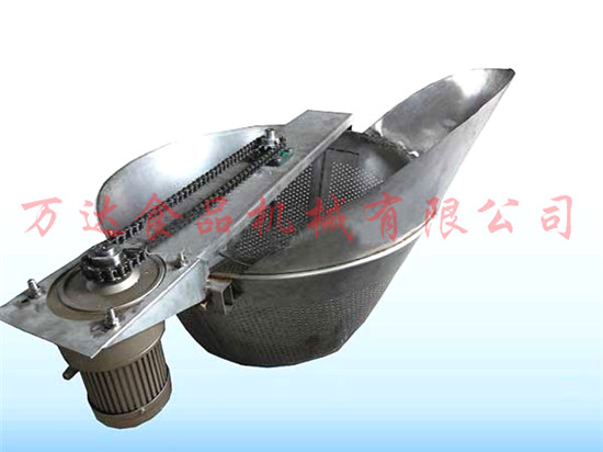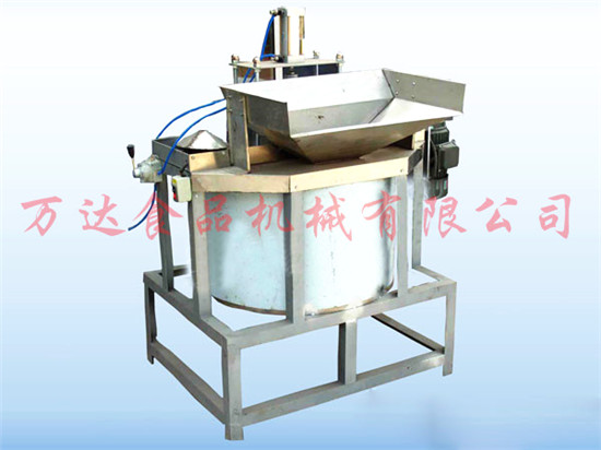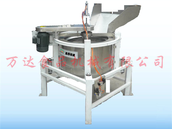 全自動脫油機的基本工作原理是利用脫油筒高速轉動產生的離心力的作用將粘附在花生米表面的附油脫離出去,脫離下來的油通過機架上的出油管流到機體外的收集桶中。脫油后的花生米通過氣缸控制脫油籠中閥的提升,從落料口通過滑落到冷卻輸送帶(或料斗)中,然后進行下一步工序處理。